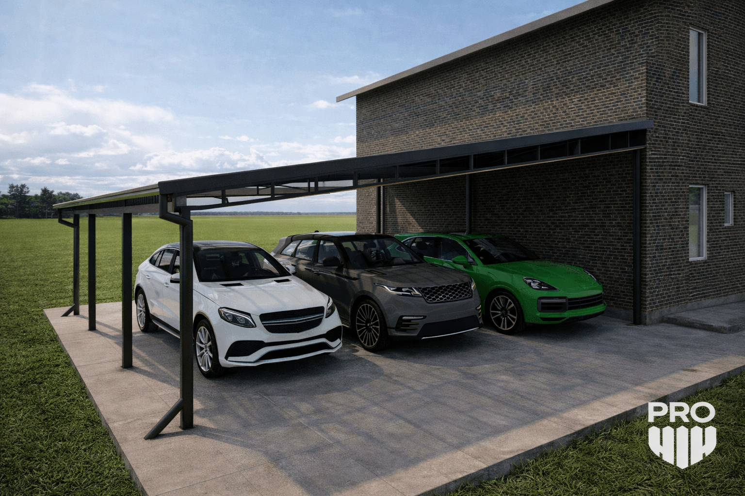 Навес для трех автомобилей — это решение для больших семей, частных домов с несколькими машинами или коммерческих объектов. Основная задача такой конструкции — обеспечить надежность при больших пролетах и удобство парковки.