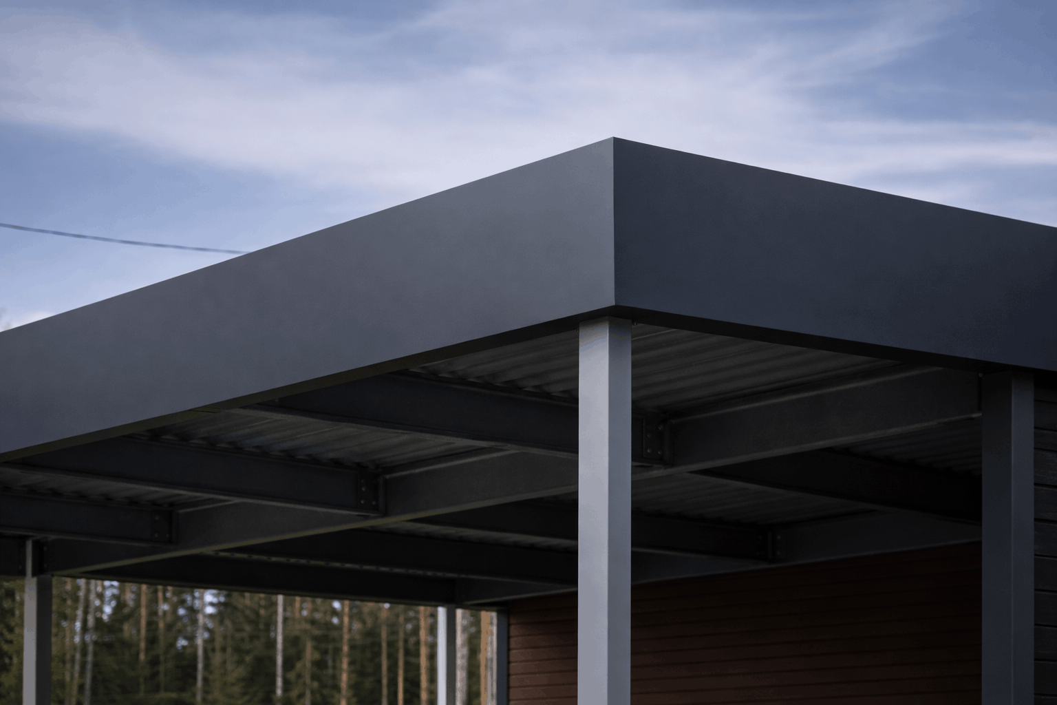 Навесы в стиле хай-тек отличаются от классических решений своей геометрией и использованием современных материалов. Плоская кровля и мощный каркас из профильной трубы и ЛСТК балок обеспечивают высокую надежность и визуальную легкость конструкции.