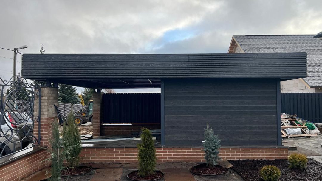 Результат — лаконичный, строгий и современный навес, который выглядит как часть дизайнерского проекта, а не хозяйственная постройка.