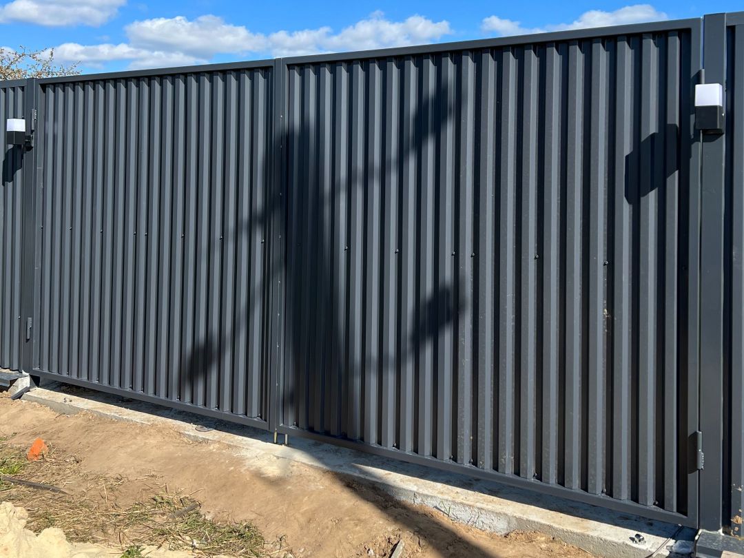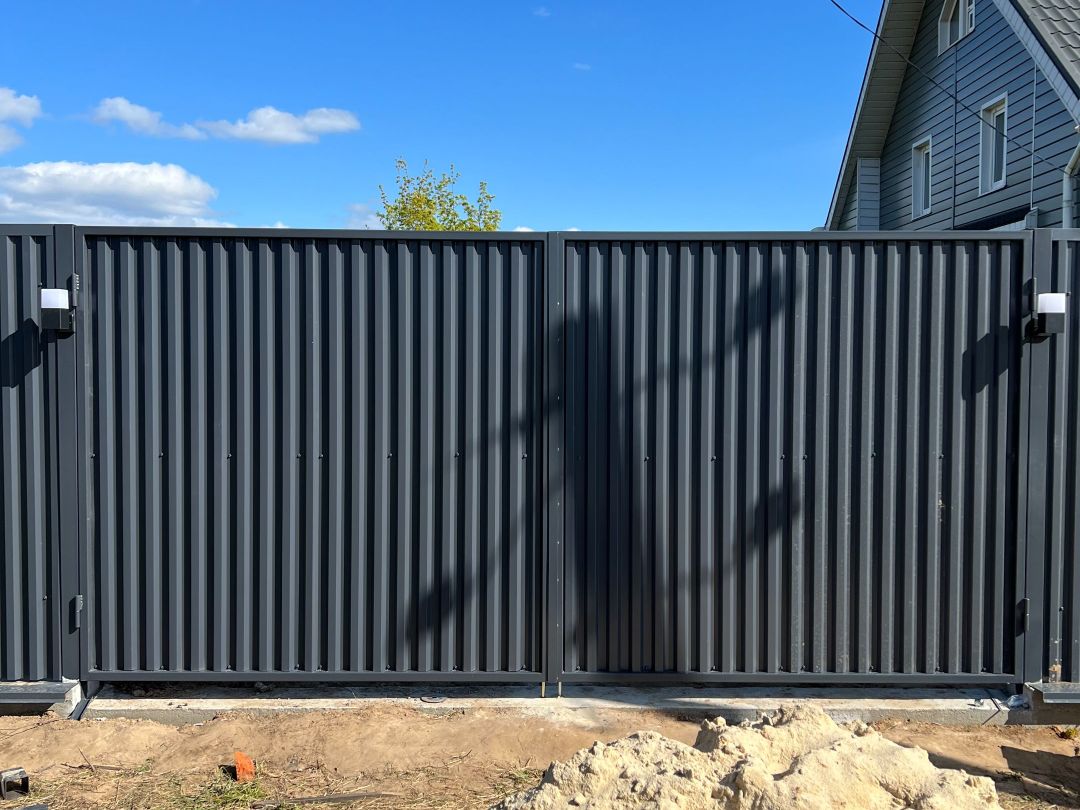 Современный забор из профнастила в цвете графит с автоматикой и подсветкой