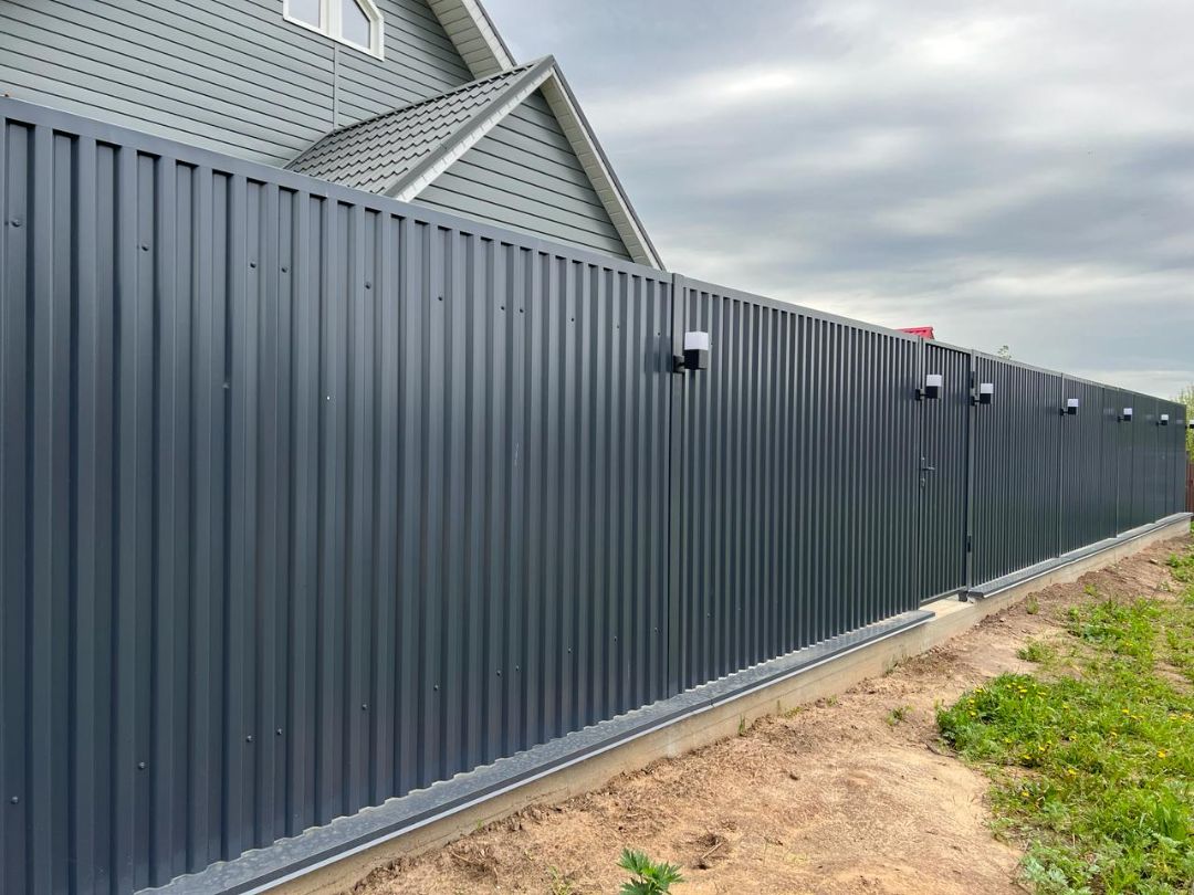 В основе проекта — забор из профнастила марки С21 в популярном цвете графит (RAL7024). Этот оттенок отлично сочетается с современной архитектурой и придаёт участку строгий, аккуратный вид. Чтобы конструкция выглядела завершённой, по верхней части забора установлена декоративная планка, которая добавляет эстетики и защищает край листа.