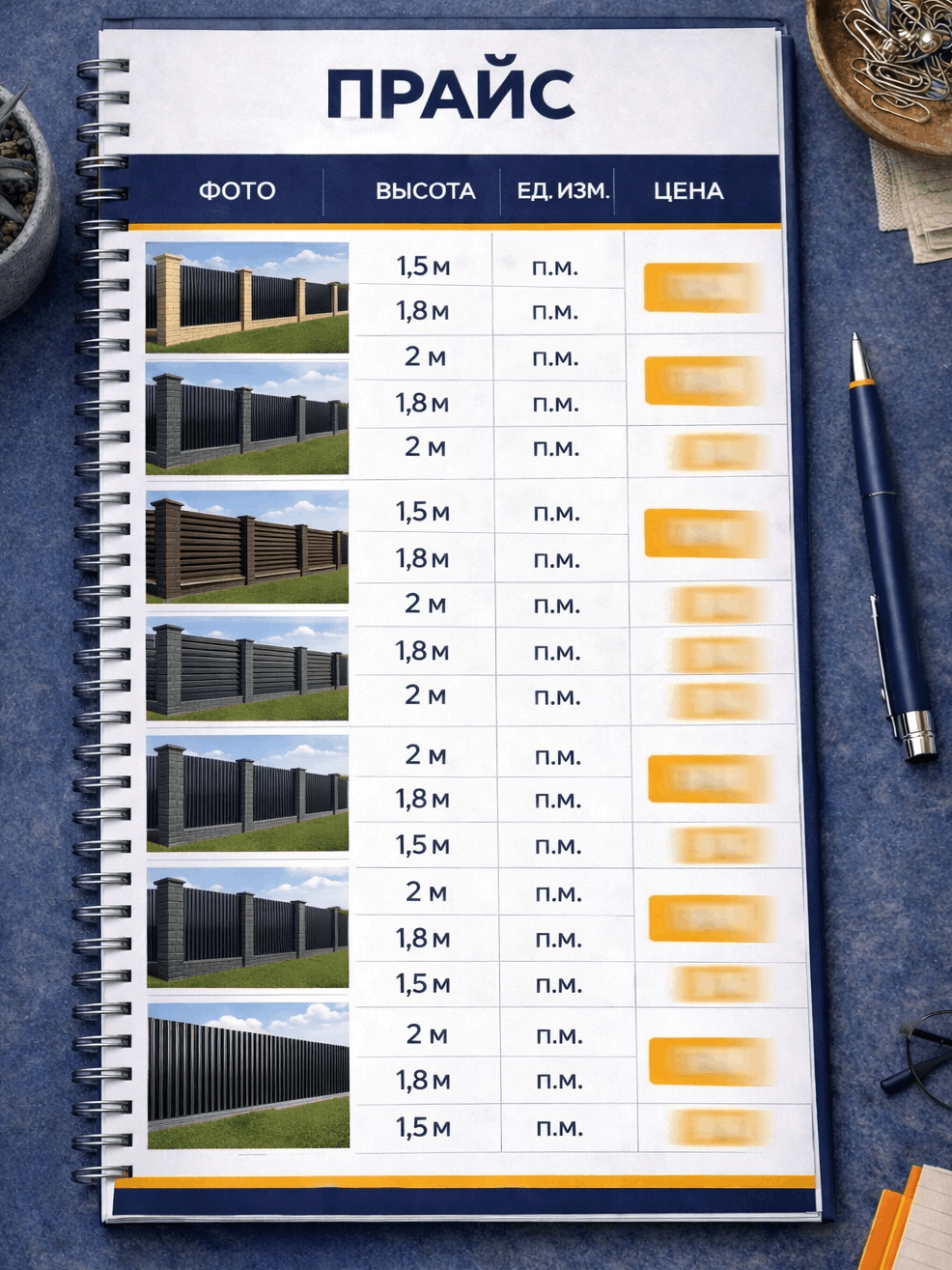 Забор с кирпичными столбами и евроштакетником шахматкой